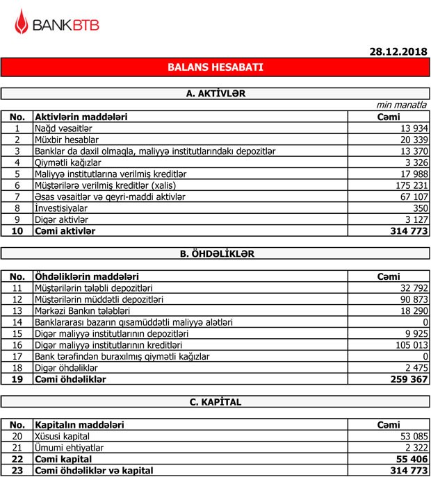2018-ci ilin sonuna “Bank BTB” ASC-nin aktivlərinin həcmi 2017-ci ilin analoji dövrü ilə müqayisədə 17,12% artaraq 314 milyon 773 min manat təşkil edib. 30 Dekabr 2017-ci il tarixinə “Bank BTB” 268 milyon 770 min manat cəmi aktivlərə malik idi.