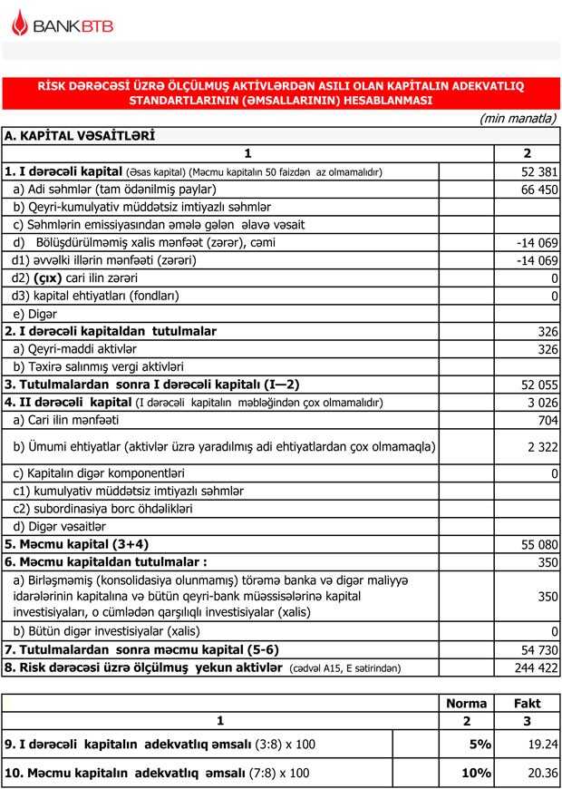 2018-ci ildə “Bank BTB”nin nizamnamə kapitalı 2017-ci ilin eyni dövrü ilə müqayisədə dəyişməyərək 66 milyon 450 min manat olduğu halda, məcmu kapitalı 2% artaraq 54 milyon 730 min manata bərabər olub.