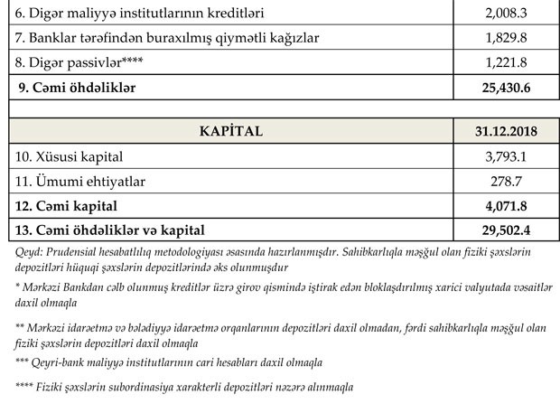 2018-ci ilin dekabr ayı ərzində bank sektorunun aktivləri 1.1% (324.8 milyon manat), öhdəlikləri 0.6% (149.2 milyon manat), balans kapitalı isə 4.1% (175.6 milyon manat) azalıb.