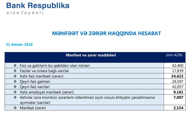 “Bank Respublika” ASC 2018-ci ili 2 milyon 154 min manat xalis mənfəət ilə başa vurub. Halbuki, Bank 2017-ci ili 10 milyon 518 min manat zərər ilə bağlamışdı.