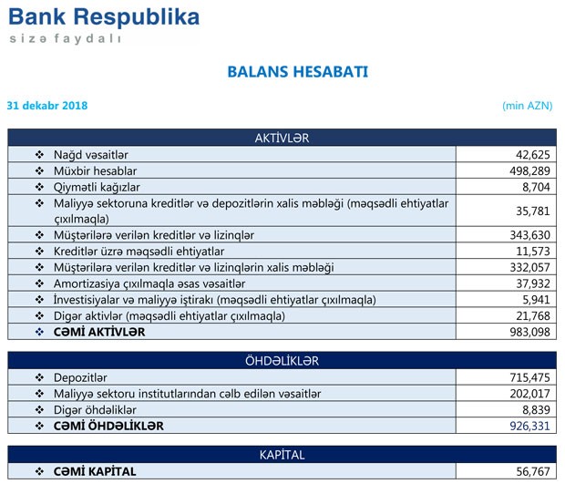 “Bank Respublika”nın aktivləri 1 milyard manata yaxınlaşıb. 31 Dekabr 2018-ci il tarixində Bankın cəmi aktivləri 983 milyon 98 min manat təşkil edib, bu 2017-ci ilin sonu ilə müqayisədə 280 milyon 984 min manat və ya 40% çoxdur. İllik müqayisədə müştərilərə verilən kreditlər və lizinqlər 229 milyon 614 min manatdan 343 milyon 630 min manata yüksəlib (114 milyon 16 min manat və ya 49,6% artım).