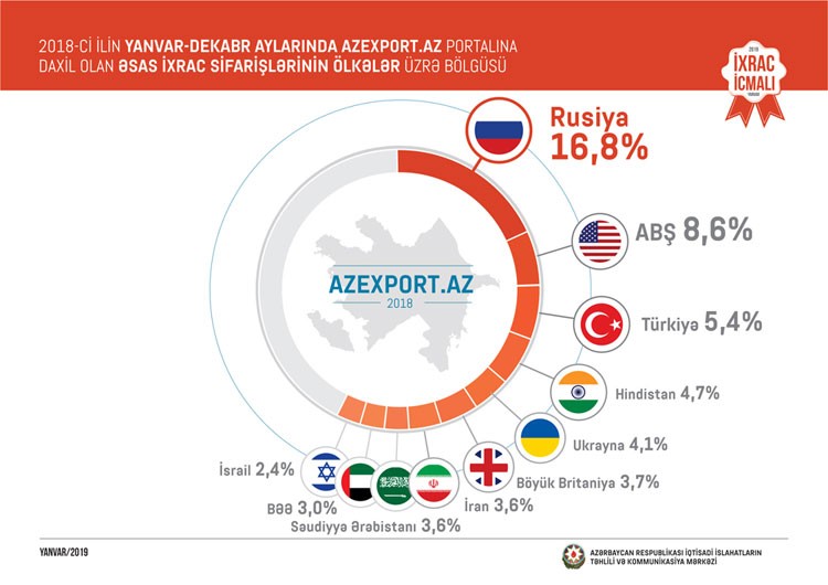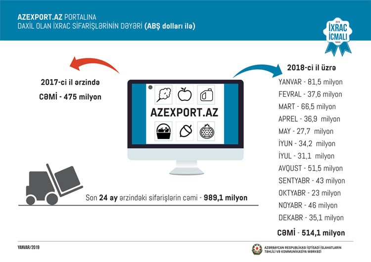 Məlumat üçün qeyd edək ki, 2017-ci ilin yanvar ayından 2018-ci ilin 31 dekabr tarixinə kimi (24 ay ərzində) Azexport.az portalına dünyanın 115 ölkəsindən daxil olan ixrac sifarişlərinin dəyəri 989,1 milyon ABŞ dolları təşkil edib.