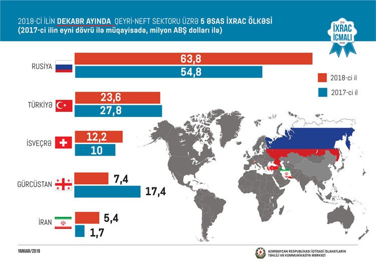 2018-ci ilin dekabr ayında isə qeyri-neft sektoru üzrə ixrac 157 milyon ABŞ dolları təşkil edib. Ötən ilin dekabr ayında qeyri-neft sektoruna aid ən çox mal ixrac edilən ölkələrin siyahısına Rusiya (63,8 milyon ABŞ dolları) başlıq edib. Daha sonra bu siyahıda Türkiyənin (23,6 milyon ABŞ dolları), İsveçrənin (12,2 milyon ABŞ dolları), Gürcüstanın (7,4 milyon ABŞ dolları), İranın (5,4 milyon ABŞ dolları) və digər ölkələrin adları var.