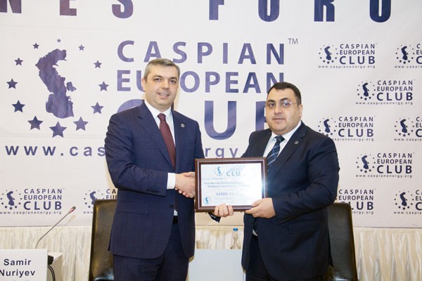 Biznes-forumda Samir Nuriyevə Caspian European Club (Caspian Business Club) və Caspian American Club-un fəxri üzvlük sertifikatı təqdim edilib.
