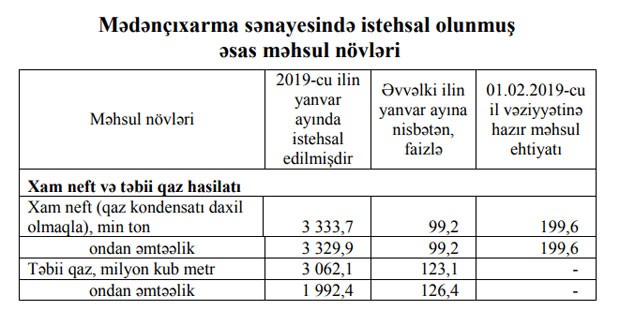 Bu ilin yanvar ayında Azərbaycanda qaz kondensatı daxil olmaqla 3 333,7 min ton həcmində xam neft hasil edilib.Bu həcmin 3 329,9 min tonu əmtəəlik xam neft olub. Bu ilin yanvar ayında neft hasilatı ötən ilin yanvar ayı ilə müqayisədə 0,8% azalıb.