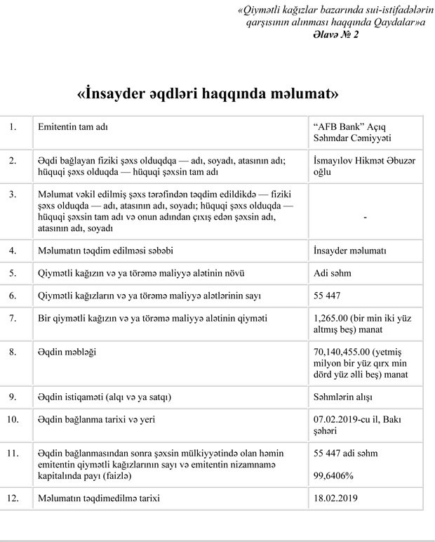 Korporativ məlumatların açıqlanması (MEAS) saytında verilən məlumata görə, H.İsmayılov 55 447 səhmi 70,140,455 (yetmiş milyon bir yüz qırx min dörd yüz əlli beş) manata əldə edib. Saziş fevralın 7-i imzalanıb.