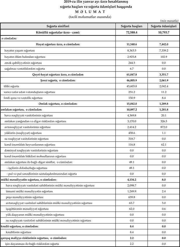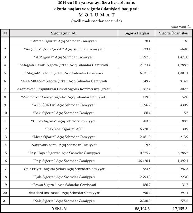 2019-cu ilin yanvar ayında ölkədə fəaliyyət göstərən sığorta şirkətləri tərəfindən 88.2 mln. manat məbləğində sığorta haqları toplanıb, 17.2 mln. manat məbləğində sığorta ödənişləri həyata keçirilib.