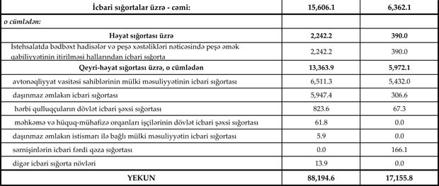Könüllü sığorta bazarı üzrə haqlar 72.6 mln. manat, ödənişlər isə 10.8 mln. manat təşkil edib. İcbari sığorta bazarı üzrə haqlar 15.6 mln. manat, ödənişlər isə 6.4 mln. manat olub.