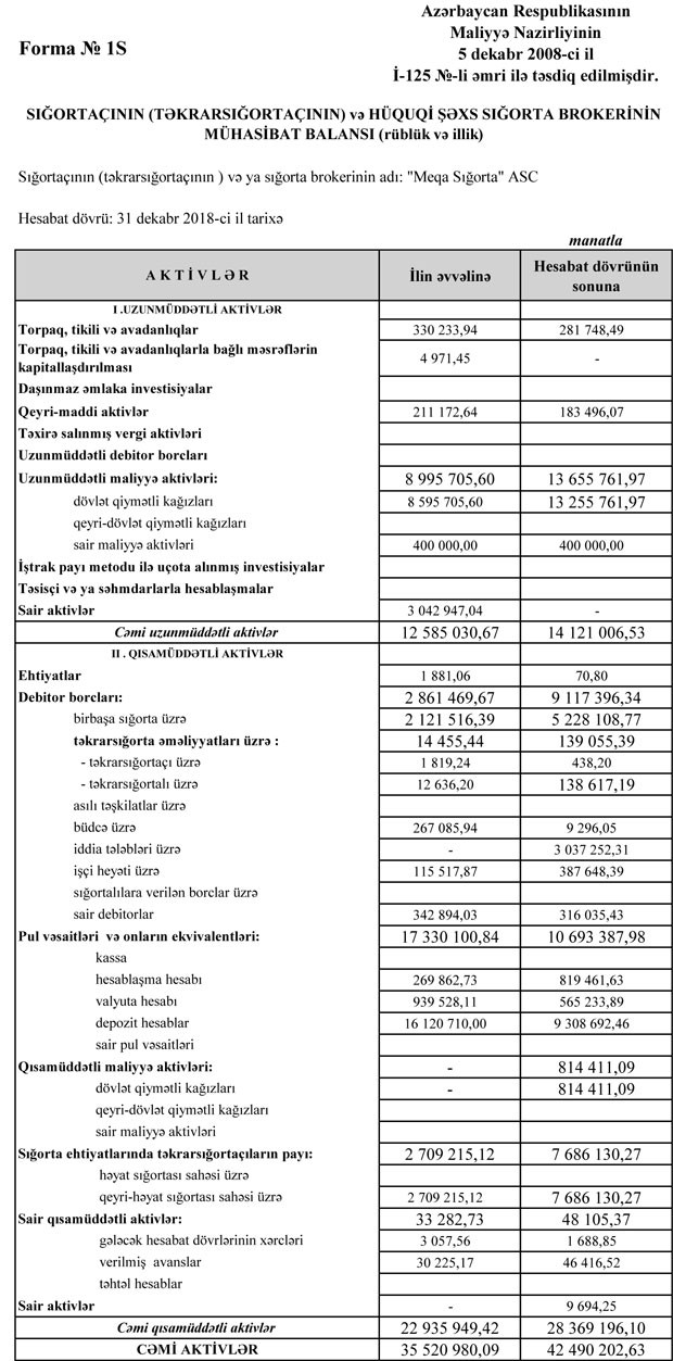 31 Dekabr 2018-ci il tarixində “Meqa Sığorta” 42 milyon 490 min manat cəmi aktivlərə, 18 milyon 647 min manat cəmi öhdəliklərə və 23 milyon 843 min manat cəmi kapitala malik olub.