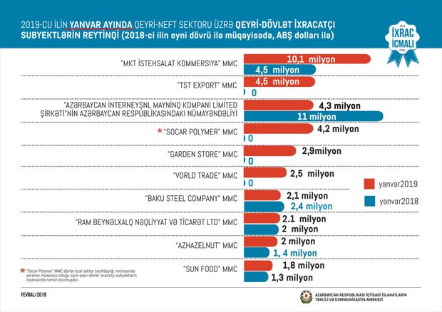 2019-cu ilin yanvar ayında qeyri-neft sektoru üzrə qeyri-dövlət ixracatçı şirkətlərin siyahısında ilk onluqda "MKT İstehsalat Kommersiya" MMC, "TST Export" MMC, “Azərbaycan İnterneyşnl Mayninq Kompani Limited Şirkəti”nin Azərbaycan Respublikasındakı nümayəndəliyi, “Socar Polymer” MMC, “Garden Store" MMC, "Vorld Trade" MMC, "Baku Steel Company" MMC, "Ram Beynəlxalq Nəqliyyat və Ticarət LTD" MMC, “Azhazelnut” MMC, “Sun Food” MMC təmsil olunub.