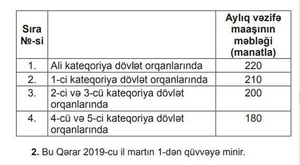 Baş nazir Novruz Məmmədov tərəfindən imzalanan qərara əsasən, 2019-cu il martın 1-dən sözügedən şəxslərin əmək haqları aşağıdakı məbləğlərdə müəyyən edilib: