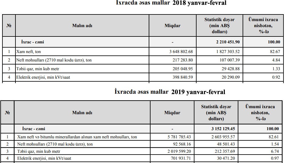 2018-ci ili eyni dövründə Azərbaycandan 1 milyard 827 milyon 303 min dollar dəyərində 3 milyon 648 min 802 ton xam neft ixrac olunmuşdu. Beləliklə, xam neft ixracı dəyər ifadəsində 42,5%, miqdar ifadəsində isə 58,5% artıb.