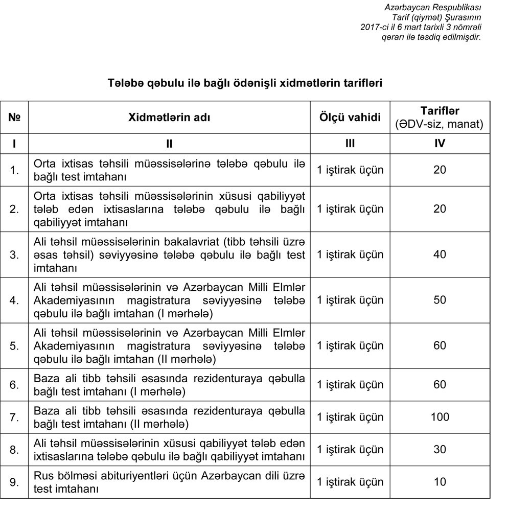 Tarif (qiymət) Şurasının iclasında ölkəmizdə həyata keçirilən sosialyönümlü siyasətə uyğun olaraq, əhalinin sosial müdafiəsini daha da gücləndirmək, maddi vəziyyətindən asılı olmayaraq hər bir Azərbaycan vətəndaşının təhsilini davam etdirməsini və insan kapitalının inkişafını təmin etmək, ali və orta ixtisas təhsili müəssisələrinə tələbə qəbulunu stimullaşdırmaq məqsədi ilə dövlət başçısının 2017-ci il 24 fevral tarixli Sərəncamına əsasən, orta ixtisas təhsili müəssisələrinə və ali təhsilin bakalavriat (tibb təhsili üzrə əsas təhsil) səviyyəsinə tələbə qəbulu ilə bağlı imtahanlarda ilk dəfə iştirak üçün müraciət etmiş ümumi təhsil müəssisələrini bitirən Azərbaycan vətəndaşlarının imtahanlarda iştirakı üçün tələb edilən məbləğin dövlət büdcəsi hesabına ödəniləcəyi qeyd edilərək, dövlət başçısının bu tapşırığının əhəmiyyəti xüsusi vurğulanmışdır.