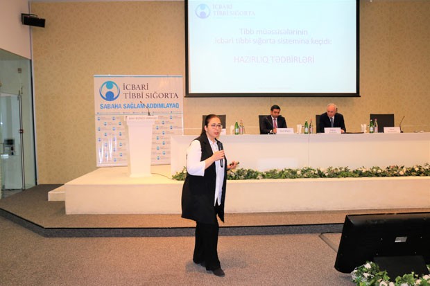 Agentliyin Səhiyyə siyasəti və kliniki kodlaşdırma şöbəsinin müdiri Şərafət İsmayılova “Xəstəxanaların icbari tibbi sığorta sisteminə keçidlə bağlı hazırlıq tədbirləri” mövzusunda təqdimatla çıxış etmişdir. O, icbari tibbi sığortanın gələn ildən ölkə üzrə tətbiqi məqsədilə xəstəxanaların qeydiyyat sisteminin təkmilləşdirilməsinin, təchizatının yaxşılaşdırılmasının, ilkin səhiyyə xidmətinin təkmilləşdirilməsinin vacibliyini vurğulamışdır. Ş.İsmayılova həmçinin, icbari tibbi sığortanın xidmətlər zərfi və maliyyə mənbələri barədə də danışmışdır.