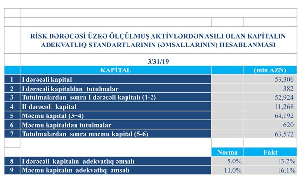 31 Mart 2019-cu il tarixində “TuranBank” 63 milyon 572 min manat məcmu kapitala malik olub, bu da 50 milyon manat olan minimal tələbdən yüksəkdir.