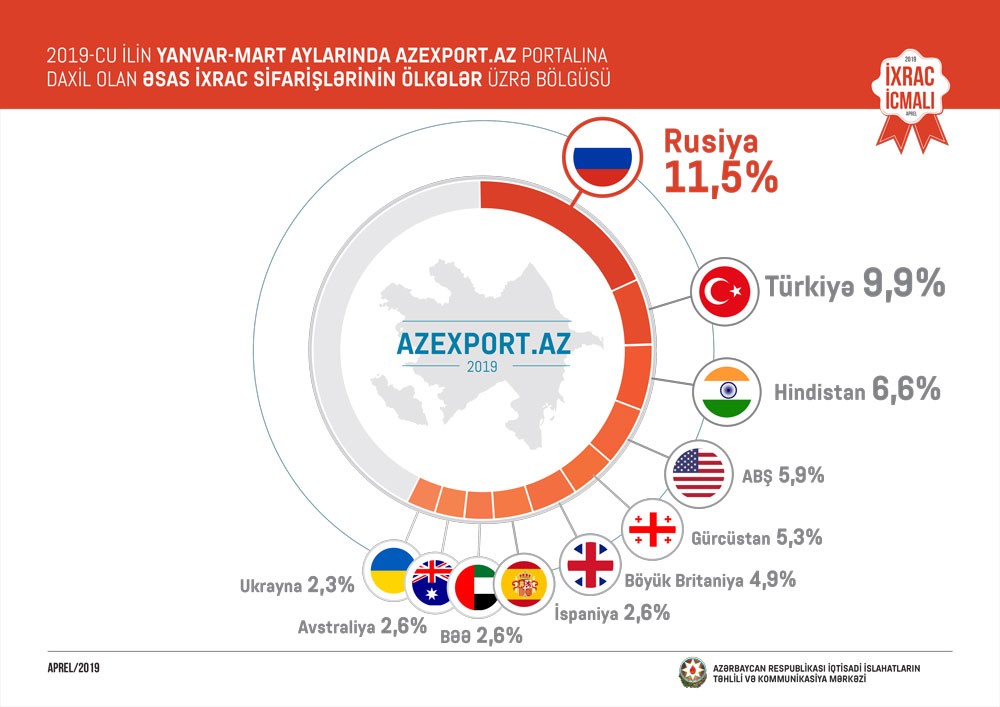 2018-ci ilin müvafiq dövrü ilə müqayisədə 2019-cu ilin ilk üç ayında Rusiyaya qeyri-neft ixracı 17%, Türkiyəyə 2%, Gürcüstana 58%, İtaliyaya 74% artıb.