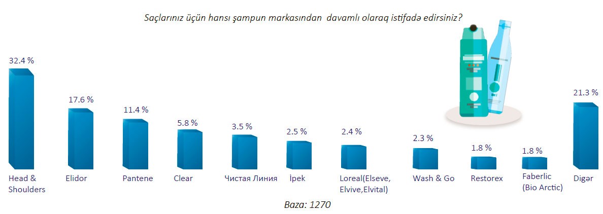 "Bu markalar arasında "Head & Shoulders" daha populyardır (32,3%). 21.3% respondent qrafikdə göstərilməyən digər şampun markalarını qeyd ediblər.