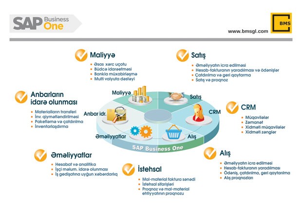 SAP BusinessOne - Müştərilərin idarə edilməsi, Təklif / Satış, Satınalma, Satıcı, İstehsalat, Bank əməliyyatları, Mühasibatlıq və Maliyə, Anbar, MRP, CRM, Satış Fürsətləri, İnsan Qaynaqları və Xidmət kimi fəaliyyət növləri və modulları özündə cəmləşdirən ERP sistemdir.