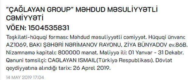 Vergilər Nazirliyi aprelin 26-da "Çağlayan Group" MMC-ni dövlət qeydiyyatına alıb.