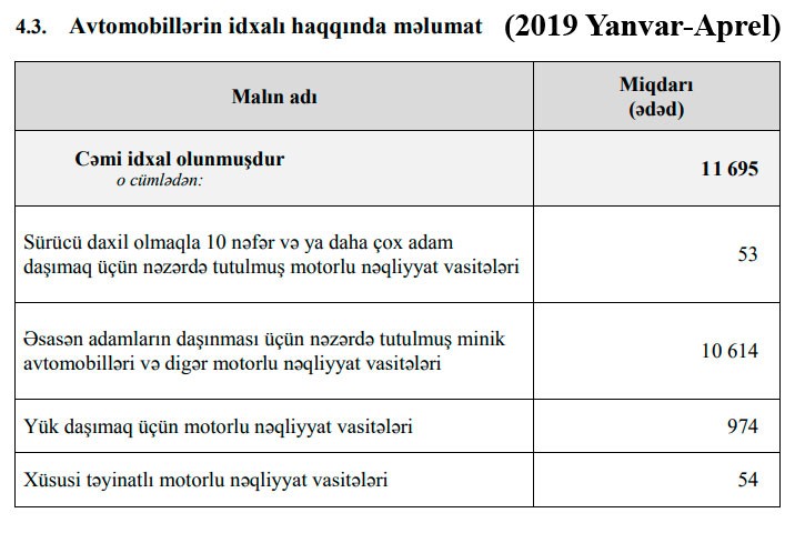 O cümlədən, 2019-cu ilin Yanvar-Aprel aylarında 10 min 614 ədəd minik avtomobili, 53 ədəd avtobus, 974 ədəd yük avtomobili və 54 ədəd xüsusi təyinatlı vasitə idxal olunub.