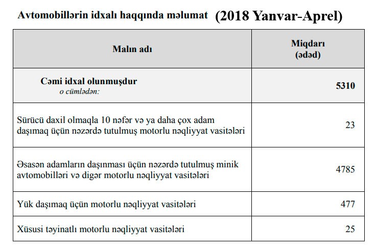 Müqayisə üçün qeyd edək ki, 2018-ci ilin Yanvar-Aprel dövründə 4 min 785 ədəd minik avtomobili, 23 ədəd avtobus, 477 ədəd yük avtomobili və 25 ədəd xüsusi təyinatlı vasitə idxal olunub.
