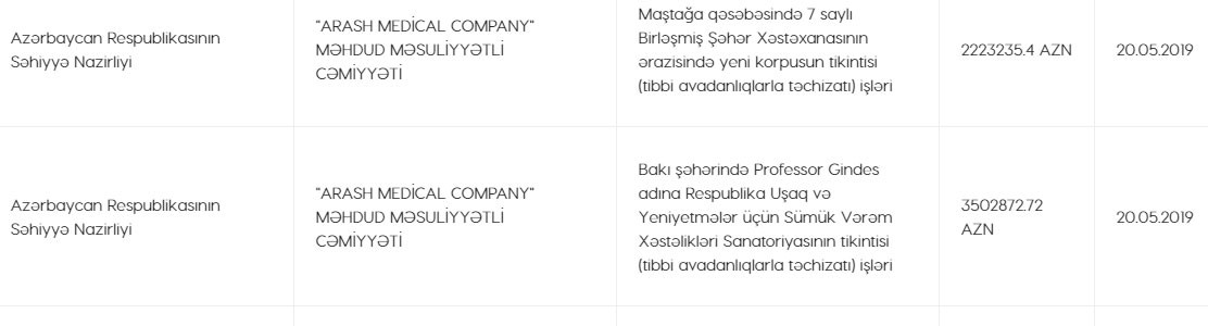 Mayın 20-də Səhiyyə Nazirliyi Bakıdakı iki tibb müəssisəsinin tibbi avadanlıqları ilə təchizatı üzrə "Arash Medical Company" MMC ilə iki müqavilə imzalayıb.