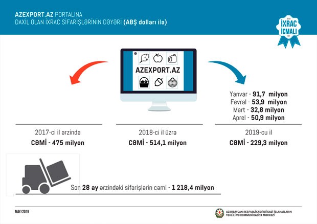 Məlumat üçün qeyd edək ki, 2017-ci ilin yanvar ayından 2019-cu ilin 30 aprel tarixinə kimi (28 ay ərzində) Azexport.az portalına dünyanın 129 ölkəsindən daxil olan ixrac sifarişlərinin dəyəri 1 218 milyon ABŞ dolları təşkil edib.