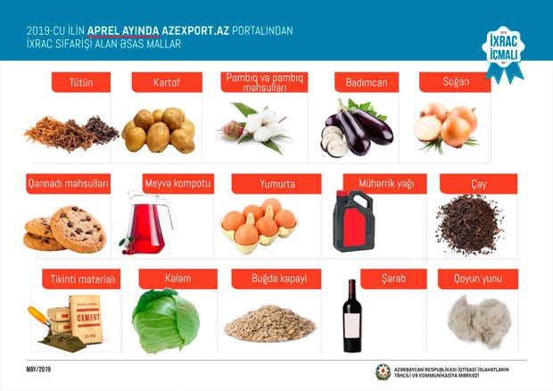 Cari ilin aprel ayında ən çox ixrac sifarişi tütün, badımcan, pambıq və pambıq məhsulları, kartof, soğan, qənnadı məhsulları, meyvə kompotu, yumurta, mühərrik yağı, çay, tikinti materialı, kələm, buğda kəpəyi, şərab, qoyun yunu, kosmetik vasitə, konservləşdirilmiş tərəvəz, alma, gül və s. mallara daxil olub.