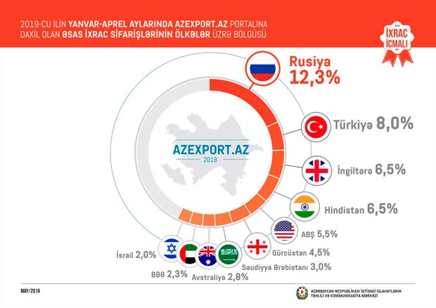 2019-cu ilin aprel ayı ərzində portala daxil olan ixrac sifarişlərinin ilk beşliyində isə Rusiya (12,3%), Türkiyə (8%), İngiltərə (6,5%), Hindistan (6,5%) və ABŞ (5,5%) qərarlaşıb.