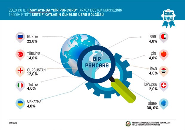 Həmçinin “İxrac İcmalı”nda göstərilib ki, bu ilin may ayında “Bir Pəncərə” İxraca Dəstək Mərkəzi vasitəsi ilə həyata keçirilən qeyri-neft ixracının dəyəri isə 16,5 milyon ABŞ dolları olub. 2019-cu ilin yanvar-may ayları ərzində “Bir Pəncərə” İxraca Dəstək Mərkəzi tərəfindən yüzlərlə sahibkara ixracla bağlı müvafiq sertifikatlar verilib və bunun nəticəsində 47,9 milyon ABŞ dolları dəyərində qeyri-neft ixracı həyata keçirilib.