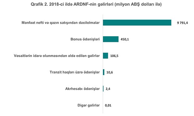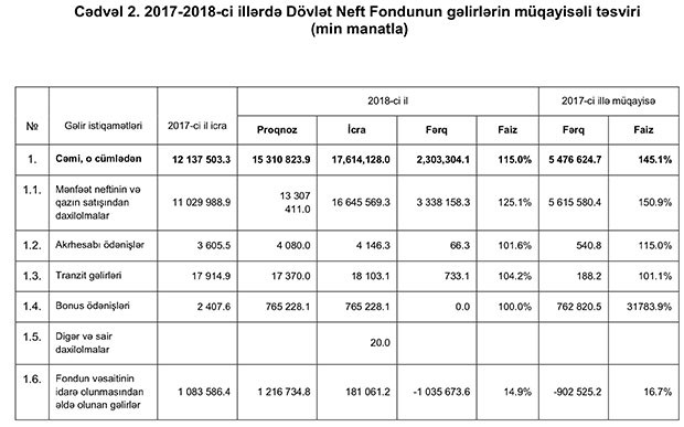 Rəydə qeyd edilib ki, 2018-ci ilin 1 yanvar tarixinə Dövlət Neft Fondunun vəsaiti 60 milyard 304,3 milyon manat və ya 35 milyard 806,5 milyon dollar təşkil etmişdir. 2018-ci il ərzində manat ifadəsilə Dövlət Neft Fondunun gəlirlərinin ümumi həcmi 17 milyard 614,1 milyon manat təşkil etməklə, büdcədə nəzərdə tutulana nisbətən (15 milyard 310,8 milyon manat) 115 faiz səviyyəsində icra edilmişdir. 2018-ci il ərzində Dövlət Neft Fondunun büdcə xərcləri 11 milyard 455,6 milyon manat təşkil etməklə, büdcədə nəzərdə tutulana nisbətən (11 milyard 480,2 milyon manat) 99,8 faiz səviyyəsində icra olunmuşdur. 2018-ci ilin sonuna Dövlət Neft Fondunun büdcəsində 6 milyard 158,5 milyon manat profisit yaranmışdır ki, bu da 2017-ci il ilə müqayisədə (1 milyard 122 milyon manat) manat ifadəsilə 5 milyard 36,5 milyon manat və yaxud 4,5 dəfə çoxdur. Beləliklə, 2018-ci il ərzində 3 milyard 622,4 milyon ABŞ dolları yığıma yönəldilmişdir. Azərbaycan Respublikası Dövlət Neft Fondunun 2018-ci il büdcəsinin (15,3– 11,5) 3,8 milyard manat məbləğində profsitlə proqnozlaşdırıldığı halda, büdcə gəlirlərinin planlaşdırılmasının baza göstəricisi olan 1 barel xam neftin orta illik ixrac qiymətinin 55,0 ABŞ dolları nəzərdə tutulmasına baxmayaraq 2018-ci il ərzində faktiki orta çəkili satış qiymətinin 71 ABŞ dolları olması, Azəri-Çıraq-Günəşli yatağında hasilat həcminin nəzərdə tutulmuş proqnoza qarşı 4,5% artması, bununla da büdcə gəlirlərinin proqnoza nisbətən 115% icrası nəticəsində Fondun büdcə gəlirlərinin xərclərini üstələməsinə və nəticədə 6,2 milyard manat (3,6 milyon ABŞ dolları) həcmində proqnozlaşdırıldığından daha çox profisitin yaranmasına şərait yaratmışdır.