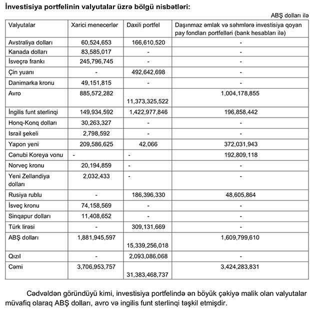 2018-ci il ərzində Dövlət Neft Fondunun investisiya portfelinə daxil olan valyutaların manata qarşı dəyişməsindən yaranan fərq üzrə büdcədənkənar xərclər (zərər) 1 milyard 589,8 milyon manat, qızılın qiymətinin dəyişməsindən yaranan fərq üzrə büdcədənkənar gəlirlər manat ifadəsində 32,5 milyon manat təşkil etmişdir.