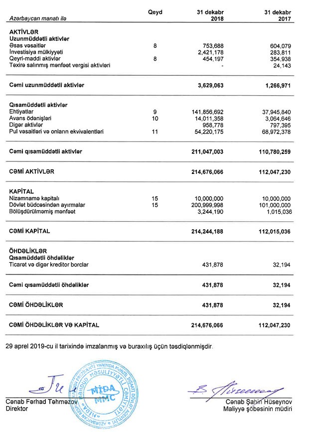 31 Dekabr 2018-ci il tarixində "MİDA" MMC 214 milyon 676 mijn manat cəmi aktivlərə, 435 min manat cəmi öhdəliklərə və 214 milyon 244 min manat cəmi kapitala malik olub. Kapitalın 10 milyon manatını nizamnamə kapitalı, 201 milyon manatını dövlət büdcəsindən ayırmalar təşkil edib.