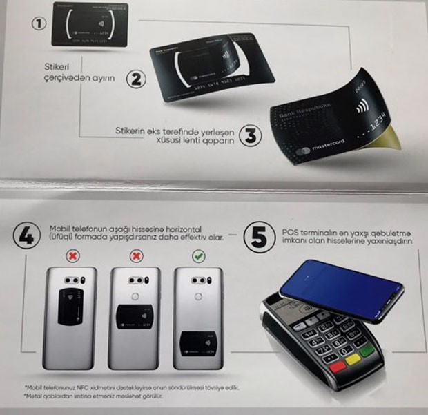 Bankın müştəriyə təqdim etdiyi stkeri telefona, çantaya və.s əşyalara yapışdırmaqla kart daşımaqdan xilas olmaq mümkündür.