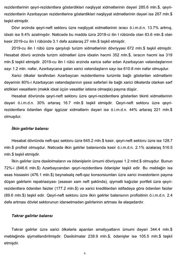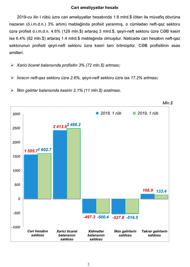 2019-cu ilin I rübü üzrə cari əməliyyatlar hesabında 1.6 mlrd.dollar (ötən ilə müvafiq dövrünə nəzərən (ö.i.m.d.n.) 3% artım) məbləğində profisit yaranmış, o cümlədən neft-qaz sektoru üzrə profisit ö.i.m.d.n. 4.6% (129 mln.dollar) artaraq 3 mlrd.dollar, qeyri-neft sektoru üzrə CƏB kəsiri isə 6.4% (82 mln.dollar) artaraq 1.4 mlrd.dollar məbləğində olmuşdur. Nəticədə cari hesabın neft-qaz sektorunun profisiti qeyri-neft sektoru üzrə kəsiri tam örtmüşdür",- Mərkəzi Bankın məlumatında deyilir.
