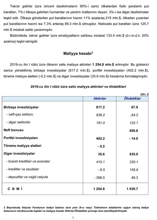 "2019-cu ilin I rübü üzrə tədiyə balansının ümumi profisiti həm neft qiymətinin yüksək olması, həm də Cari Əməliyyatlar Balansında (CƏB) yaranmış müsbət tendensiyalar hesabına formalaşmışdır. Cari Əməliyyatlar Balansında yaranmış 1.6 mlrd.dollarlıq profisit ehtiyat aktivlərinin artmasını şərtləndirmişdir