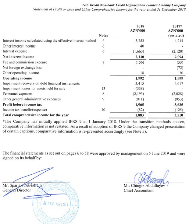 Faiz xərclərinin azalmasının təsiri ilə, “TBC Kredit”in ötən il əməliyyat mənfəəti 2017-ci il səviyyəsində olub: 1 milyon 992 min manat.