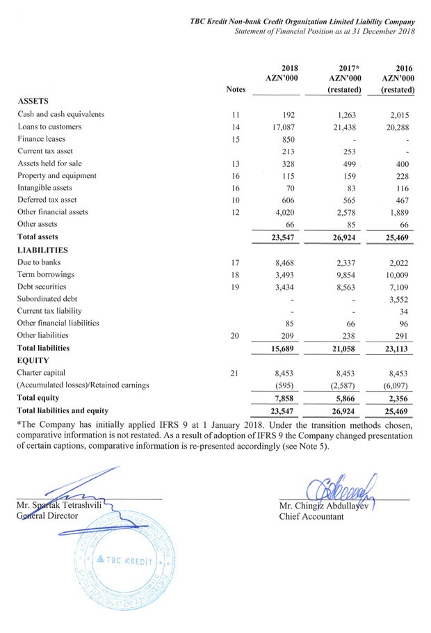 31 Dekabr 2018-ci il tarixində “TBC Kredit” 23 milyyon 547 min manat cəmi aktivlərə, 15 milyon 689 min manat cəmi öhdəliklərə və 7 milyon 858 min manat cəmi kapitala malik olub. “TBC Kredit”in nizamnamnə kapitalı isə 8 milyon 453 min manat təşkil edib.
