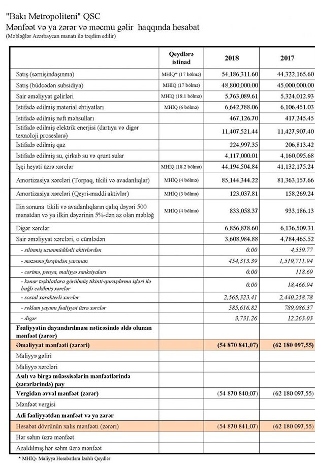 Ötən il də xərclər gəlirləri üstələdiyindən “Bakı Metropoliteni” zərərdən çıxa bilməyib. 2018-ci ildə “Bakı Metropoliteni” QSC-nin 108 milyon 749 min manat cəmi gəlirlərinə qarşılıq cəmi xərcləri 163 milyon 620 min manat təşkil edib. Bu səbəbdən 54 milyon 871 min manat zərər yaranıb.