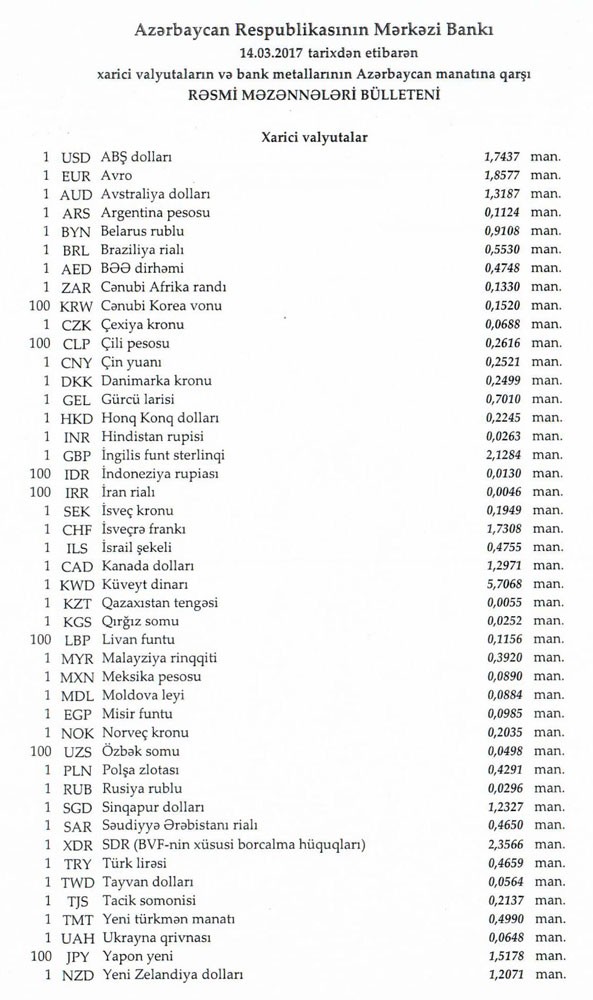 Martın 14-nə Mərkəzi Bankın açıqladığı rəsmi Dollar/manat məzənnəsi Martın 13-ü ilə müqayisədə dəyişməyərək 1,7437 manat olub, Avro/manat məzənnəsi isə 1.8577 manata düşüb .