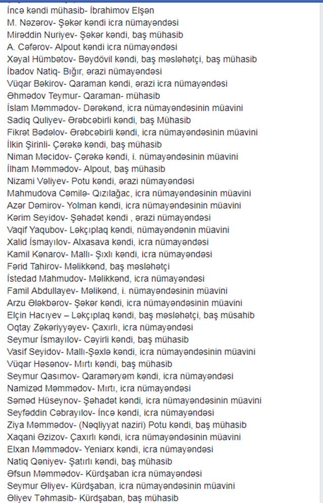 Siyahıda adı keçən şəxslər bir neçə kəndin icra nümayəndəsi, icra nümayəndəsinin müavinləri və mühasiblərdir. Yayılan ərizələrdə həmin şəxslərin səhhətində problemin olması ilə bağlı işdən çıxmaq istədiyi vurğulanır.