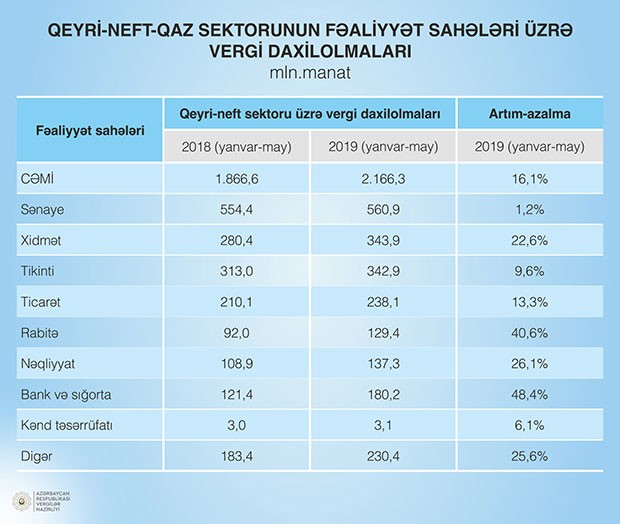Cari ilin 5 ayında qeyri-neft-qaz sektorunun bütün fəaliyyət sahələrində vergi daxilolmalarının artımı müşahidə edilib. Daxilolmalarda ən yüksək artım templəri bank və sığorta sektorunda (48,4 faiz), rabitə sahəsində (40,6 faiz), nəqliyyat sahəsində (26,1 faiz), xidmət sektorunda (22,6 faiz), ticarət sahəsində (13,3 faiz), o cümlədən pərakəndə ticarətdə (32,4 faiz), tikinti sahəsində (9,6 faiz), digər fəaliyyət sahələrində (25,6 faiz) qeydə alınıb.