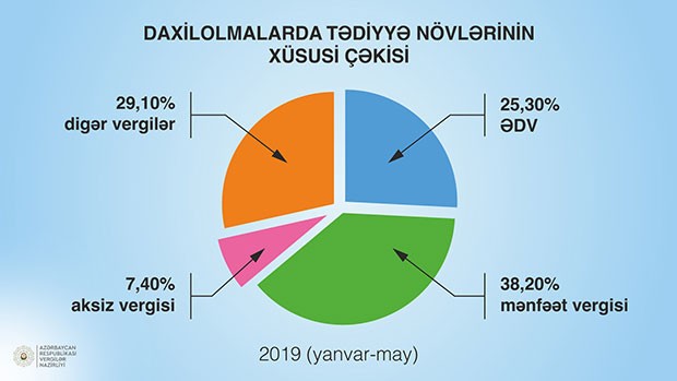 2019-cu ilin yanvar-may aylarında Vergilər Nazirliyi tərəfindən dövlət büdcəsinə 3 milyard 139,3 milyon manat vergi səfərbər olunub, proqnoza 110,1 faiz səviyyəsində əməl edilib. Ötən ilin müvafiq dövrü ilə müqayisədə vergi daxilolmaları 8,3 faiz və ya 239,9 milyon manat artıb.