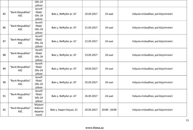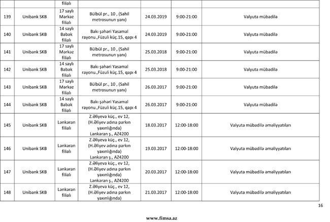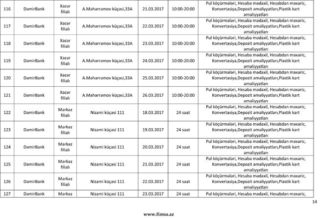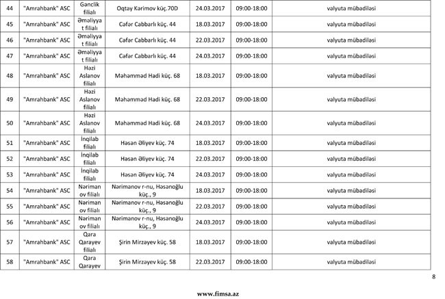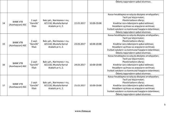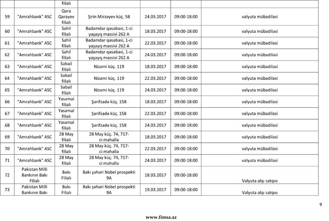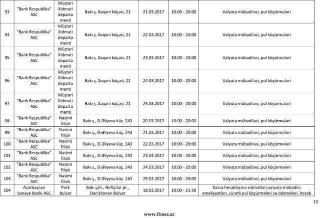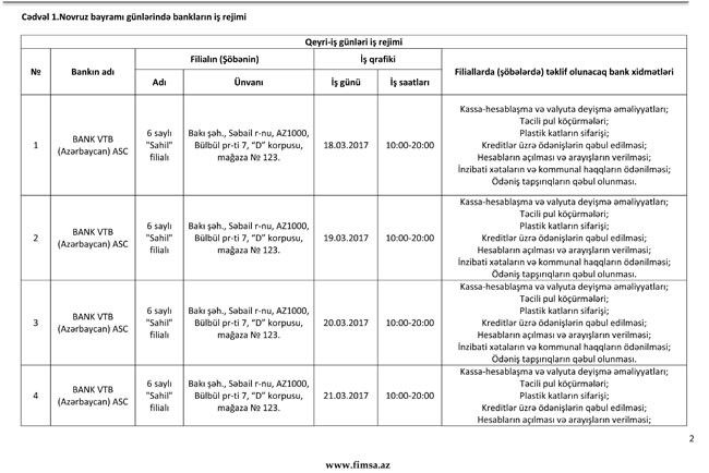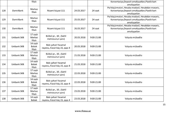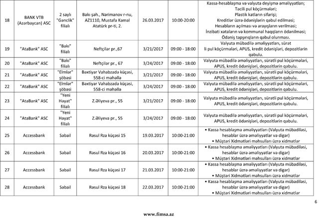 18-26 mart tarixlərində çalışacaq bank filial və şöbələrinin siyahısı və ünvanları ilə www.fimsa.az saytında tanış olmaq olar.