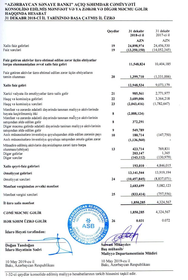 "Azərbaycan Sənaye Bankı" 2018-ci ili 1 milyon 850 min manat xalis mənfəət ilə başa vurub, bu 2017-ci illə müqayisədə 2,3 dəfə azadır.