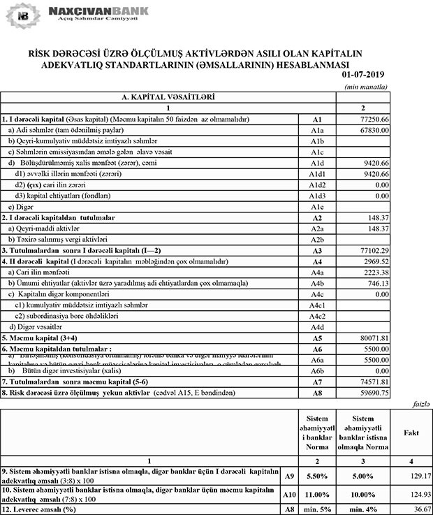 30 İyun 2019-cu il tarixində “Naxçıvanbank” ASC 215 milyon 763 min manat cəmi aktivlərə, 135 milyon 363 min manat cəmi öhdəliklərə və 80 milyon 400 min manat cəmi kapitala malik olub.