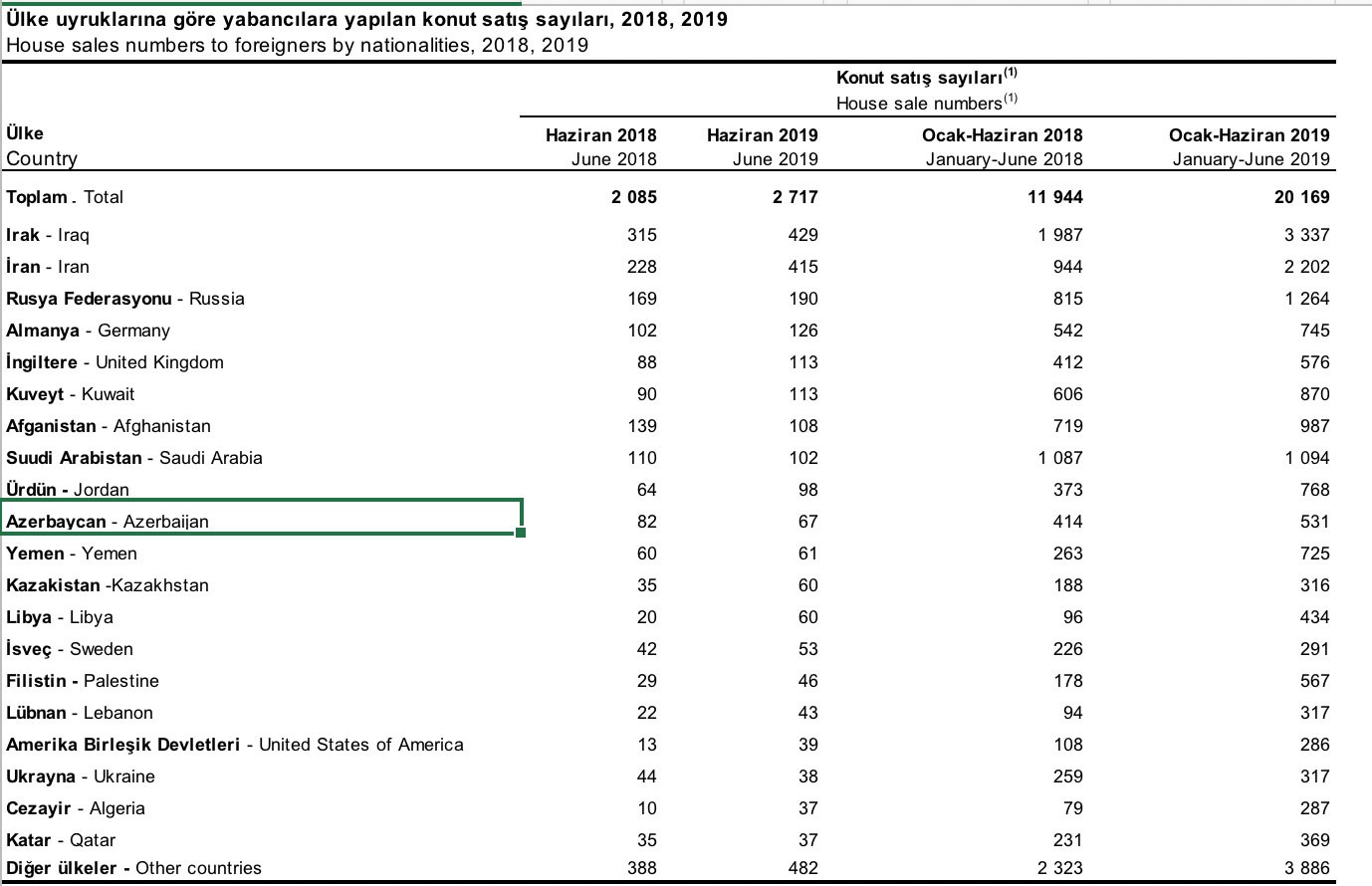2019-cu ilin Yanvar-İyun dövründə (ilk 6 ayda) isə azərbaycanlılar Türkiyədə 531 mənzil alıblar (orta hesabla hər gün 3 mənzil). 2018-ci ilin eyni dövründə bu say 414 idi.