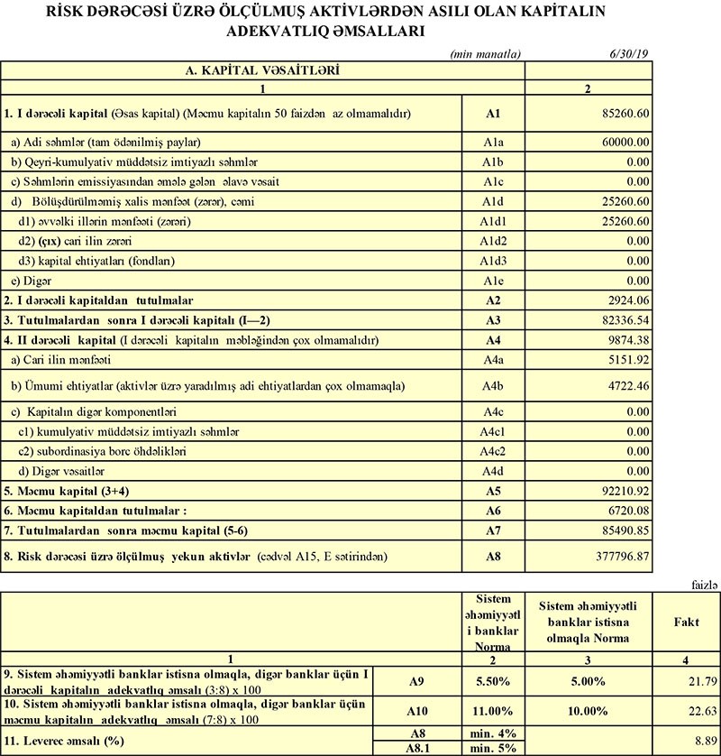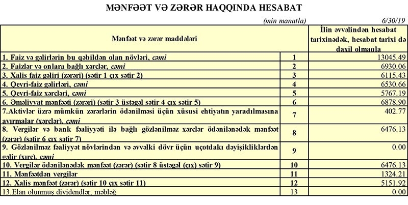 “Azərbaycan Sənaye Bankı” ilk 6 aydakı 6 milyon 879 min manat əməliyyat mənfəətinin 403 min manatını aktivlər üzrə mümkün zərərlərin ödənilməsi üçün xüsusi ehtiyatın yaradılmasına ayırıb (ötən il 615 min manat) və 1 milyon 324 min manat mənfəət vergisi ödəyib. Nəticədə Bank 2019-cu ilin 1-ci yarısını 5 milyon 152 min manat xalis mənfəət ilə başa vurub.