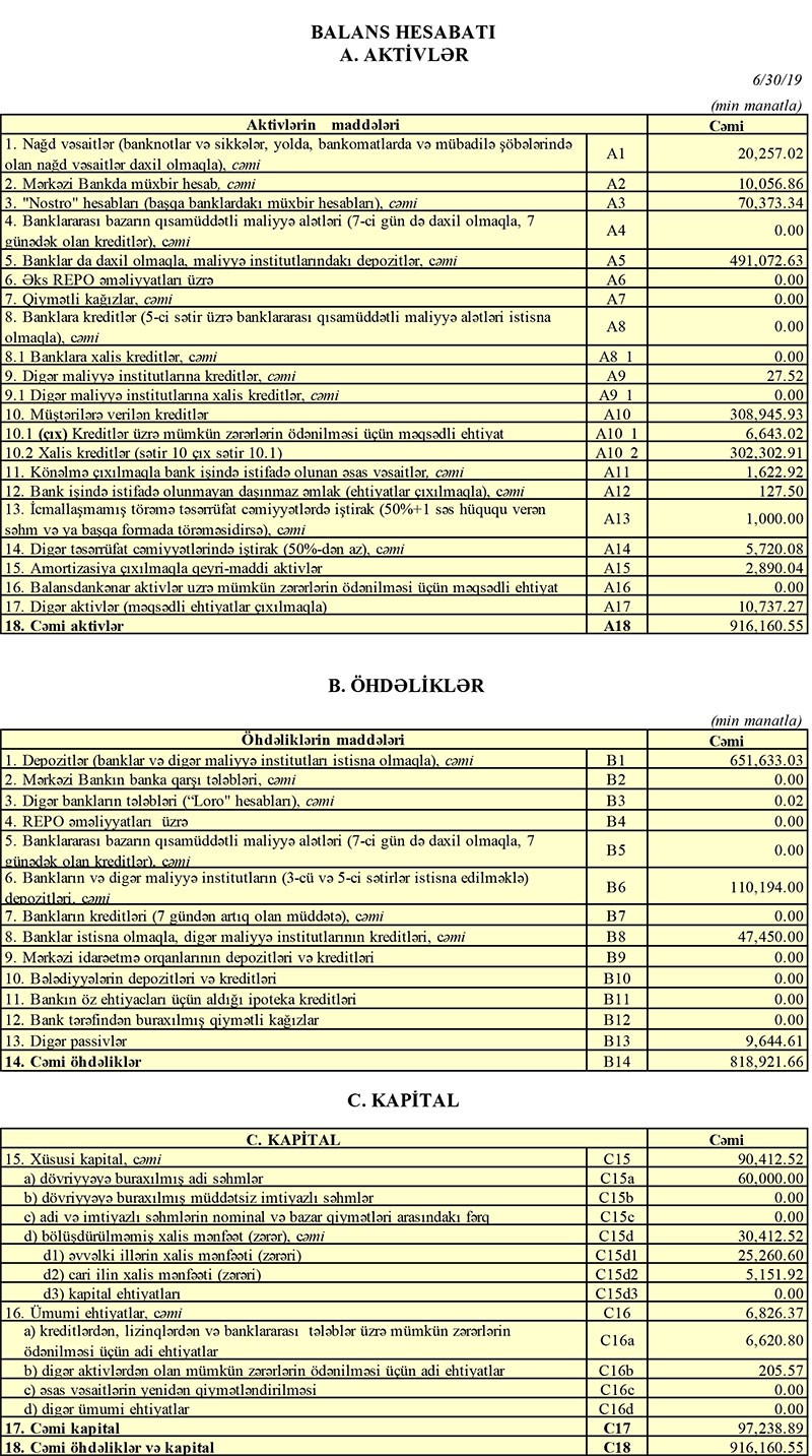 31 İyun 2019-cu il tarixində “Azərbaycan Sənaye Bankı” 916 milyon 160 min manat cəmi aktivlərə (o cümlədən 308 milyon 945 min manatı müştərilərə verilən kreditlər), 818 milyon 921 min manat öhdəliklərə (o cümlədən 651 milyon 633 min manatı depozitlər) və 97 milyon 238 min manat cəmi balans kapitalına malik olub.