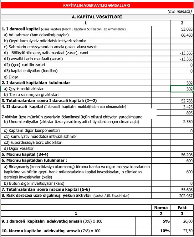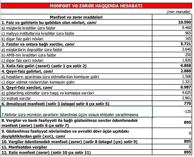 Müqayisə üçün qeyd edək ki, 2018-ci ilin birinci yarısında aktivlər üzrə mümkün zərərlərin ödənilməsi üçün yaradılmış ehtiyatın 693 min manatı azad olduğundan bankın mənfəəti 355 min manatdan 1 milyon 48 min manata yüksəlmişdi.